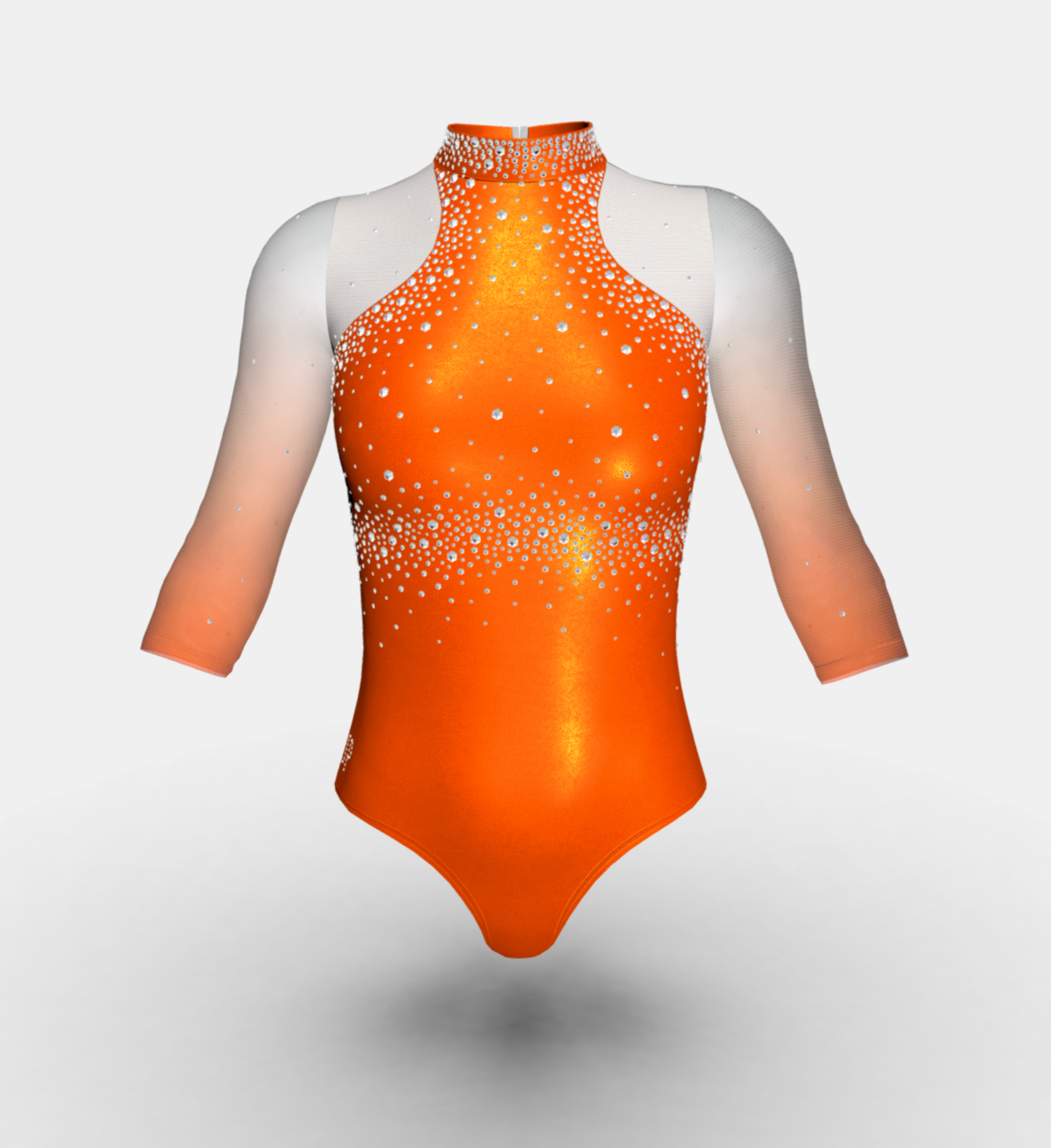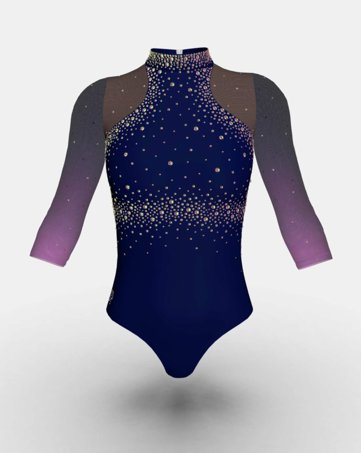 A unique design innovation. The Clara design has been crafted in a high neckline shape with design lines that create a curving shape through the body. The neckband is finished with a clasp and keyhole feature for ease. Upper front and back mesh panels are lined in skin for complete coverage. The back design features contrasting colour straps for an added pop at the back. The sleeves are sublimated in an ombre design. Crystals form the body in a heavy to light scatter through the front chest and back creating a unique shape and belted crystal detail. The crystal colour is unique, called transmission, it takes on the colour of the garment with a gold sparkle finish.