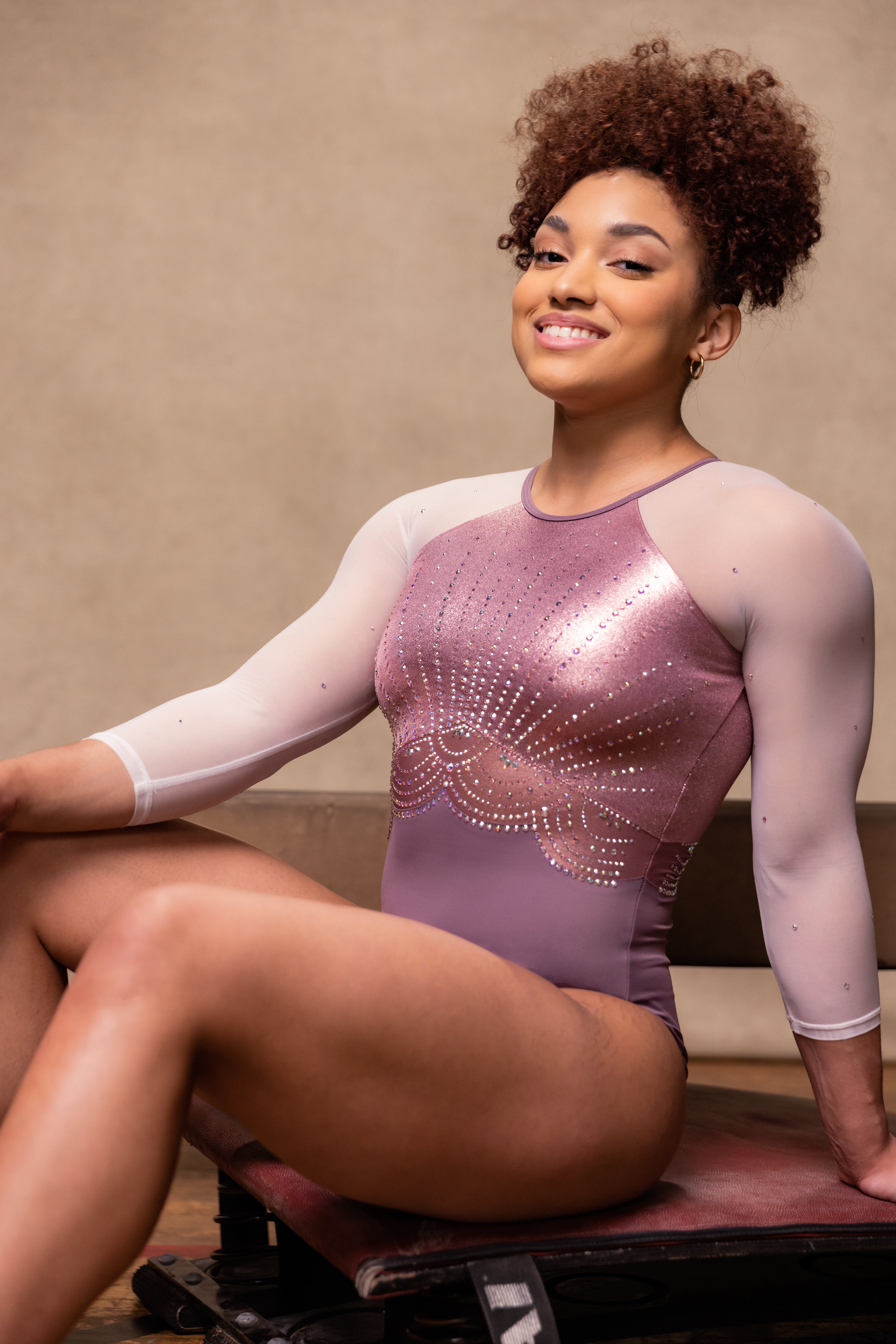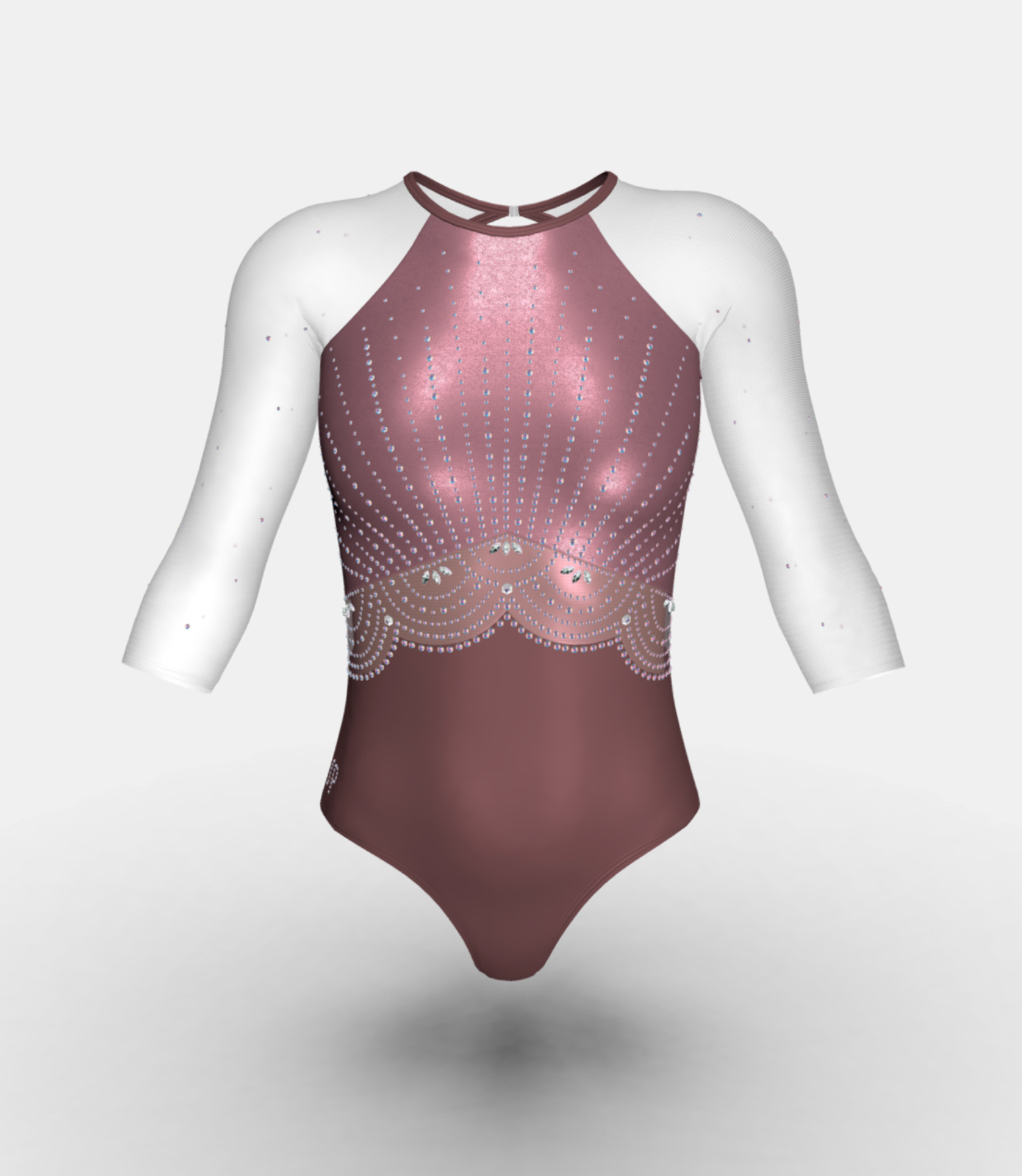 Inspired by some of Maggie Nichols most favorite competition leotards of all time – she wanted to show the world how your confidence can shine from the inside out. Crafted in a round neckline shape with back neck clasp and keyhole for ease of movement. The real unique feature of this design is the scalloped mesh belt that is skin lined for complete coverage. Front bodice has been made from a metallic rose gold mystique fabrication whilst the lower is made from a matt lycra to give the wearer a contrast between shine and matt. The crystals shimmer up and out from the belt, with a beautifully engineered scalloped crystal belt.