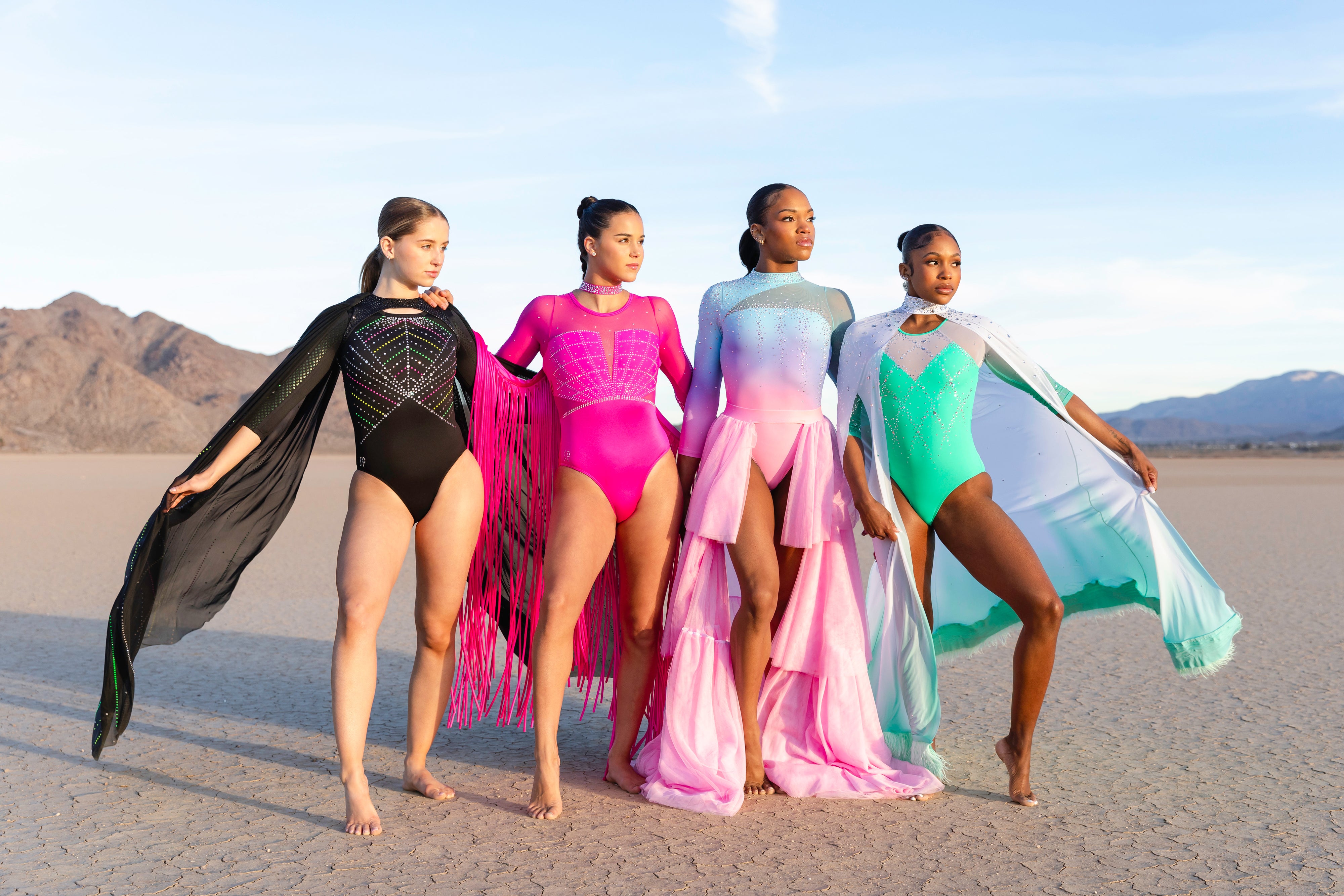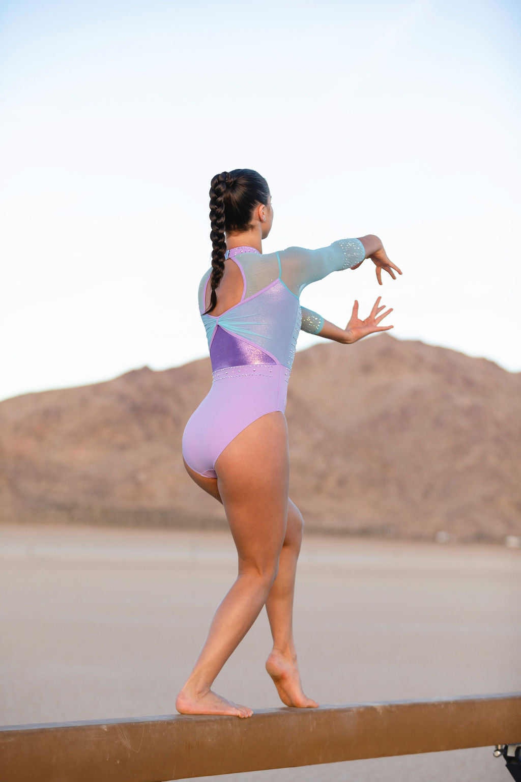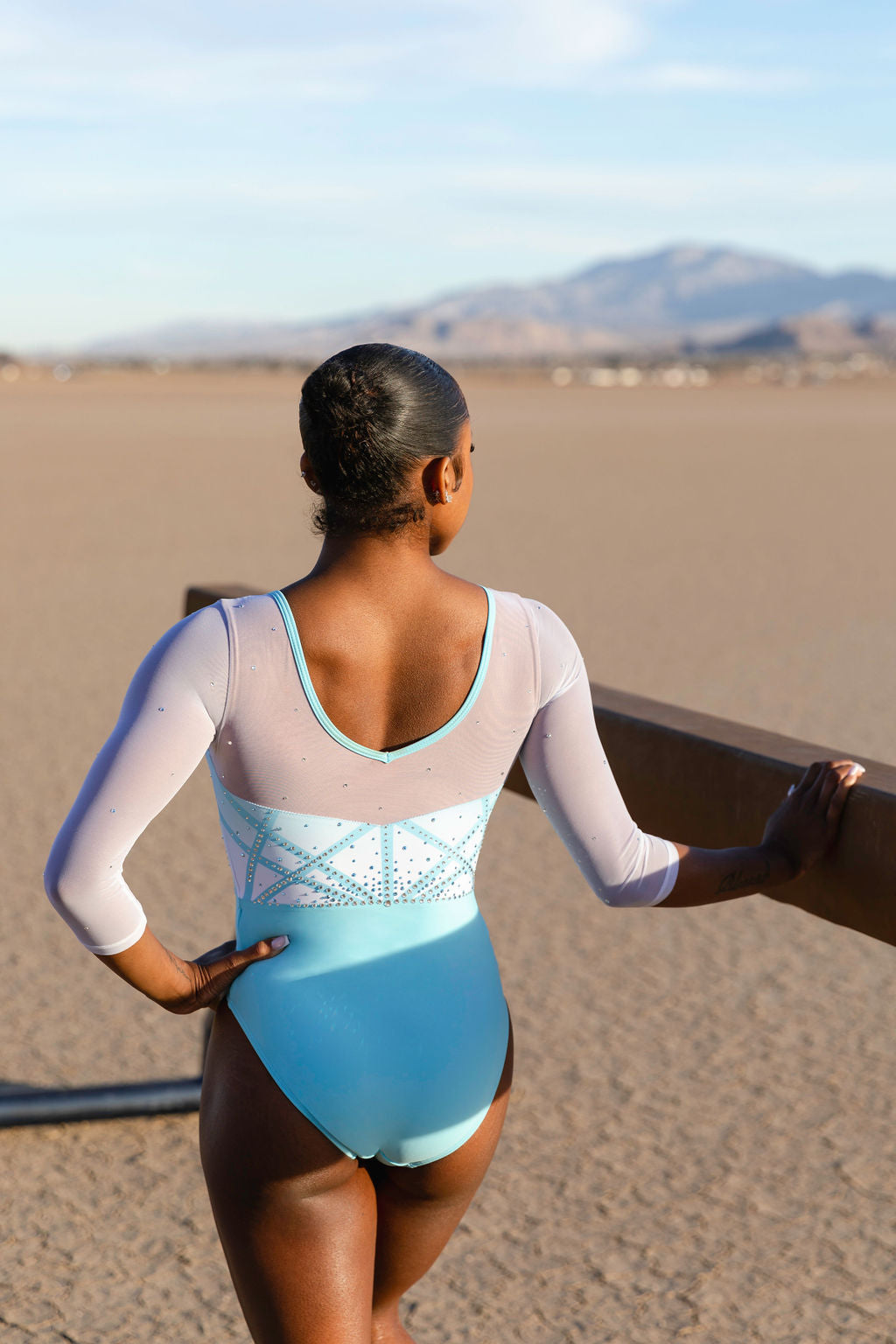 High fashion and editorial—the Shi leotard was inspired by Shilese Jones’s 2023 Championships look of the same design. Styled in a high neck with a neckband and clasp at the back, the asymmetric design flows with the body. Angled mesh panelling combines with a curved keyhole back and a one-shoulder design. Sleeves are cut from textural fabrications, one matt lycra and one mesh. The all-over freeform ombre is eye-catching and femme. The AB-coloured stones are the showstopping hero, with heavy scattering through the neck and shoulder, expanding to delicate icicles through the bodice. Embellished with crystals by Swarovski®.