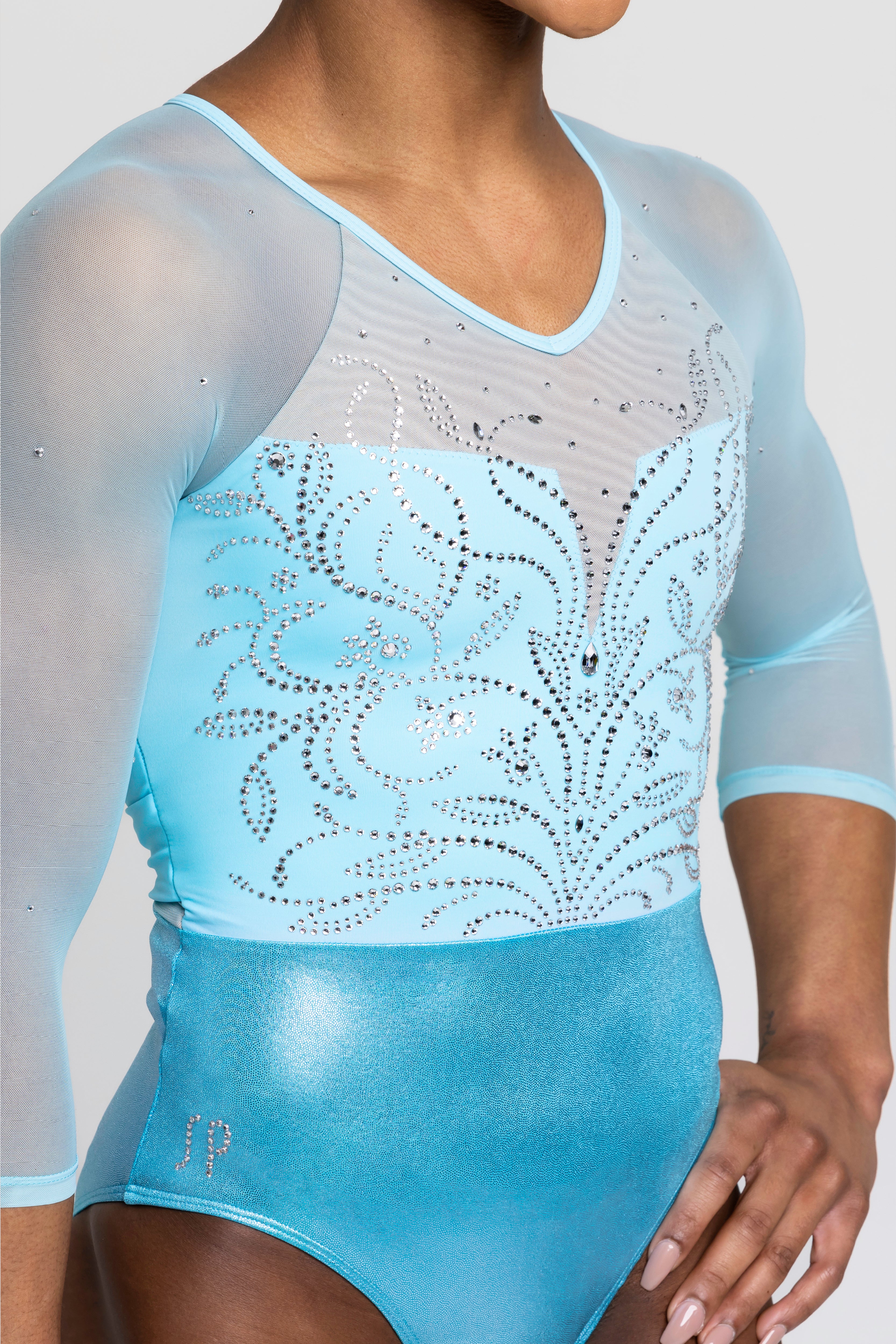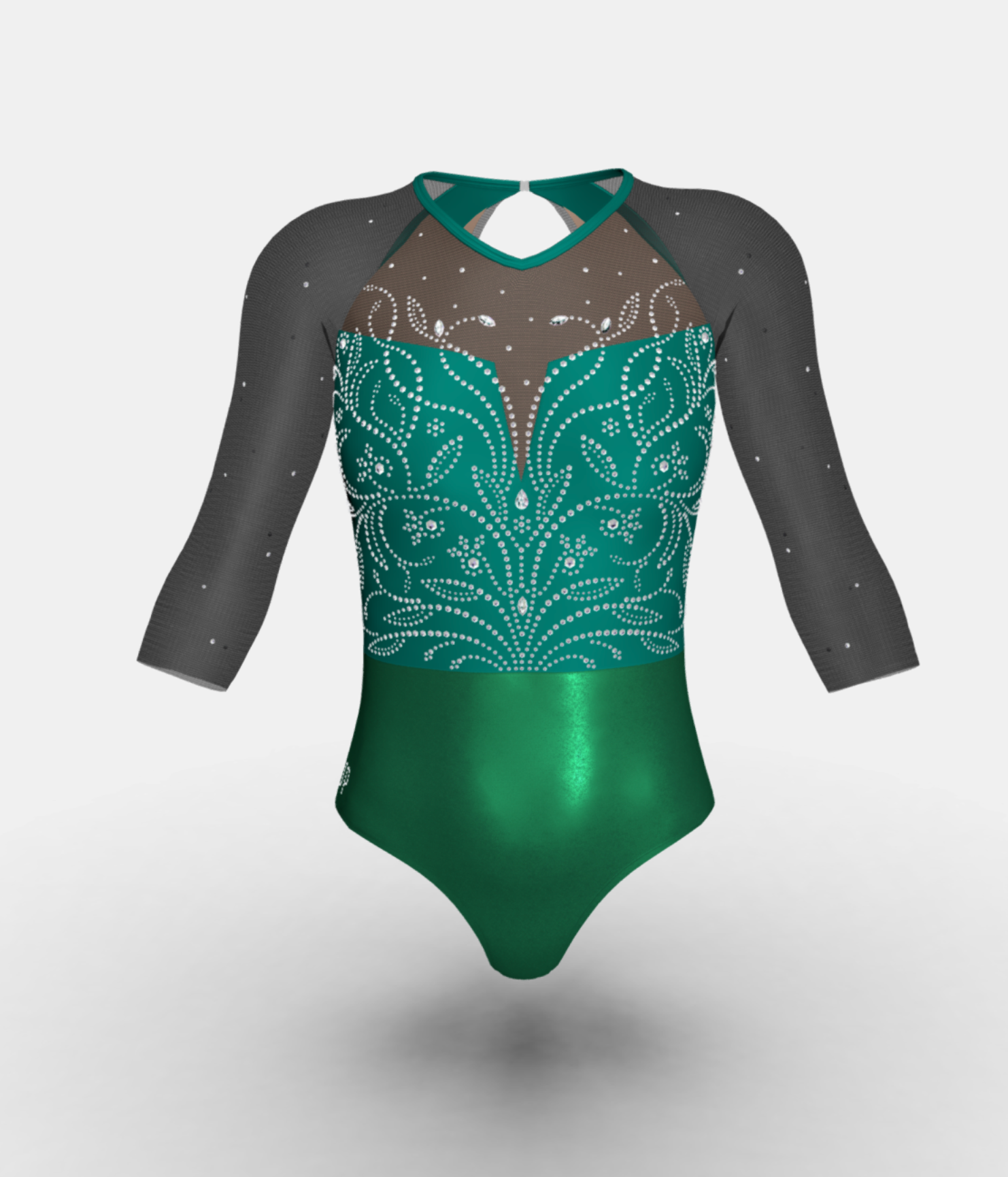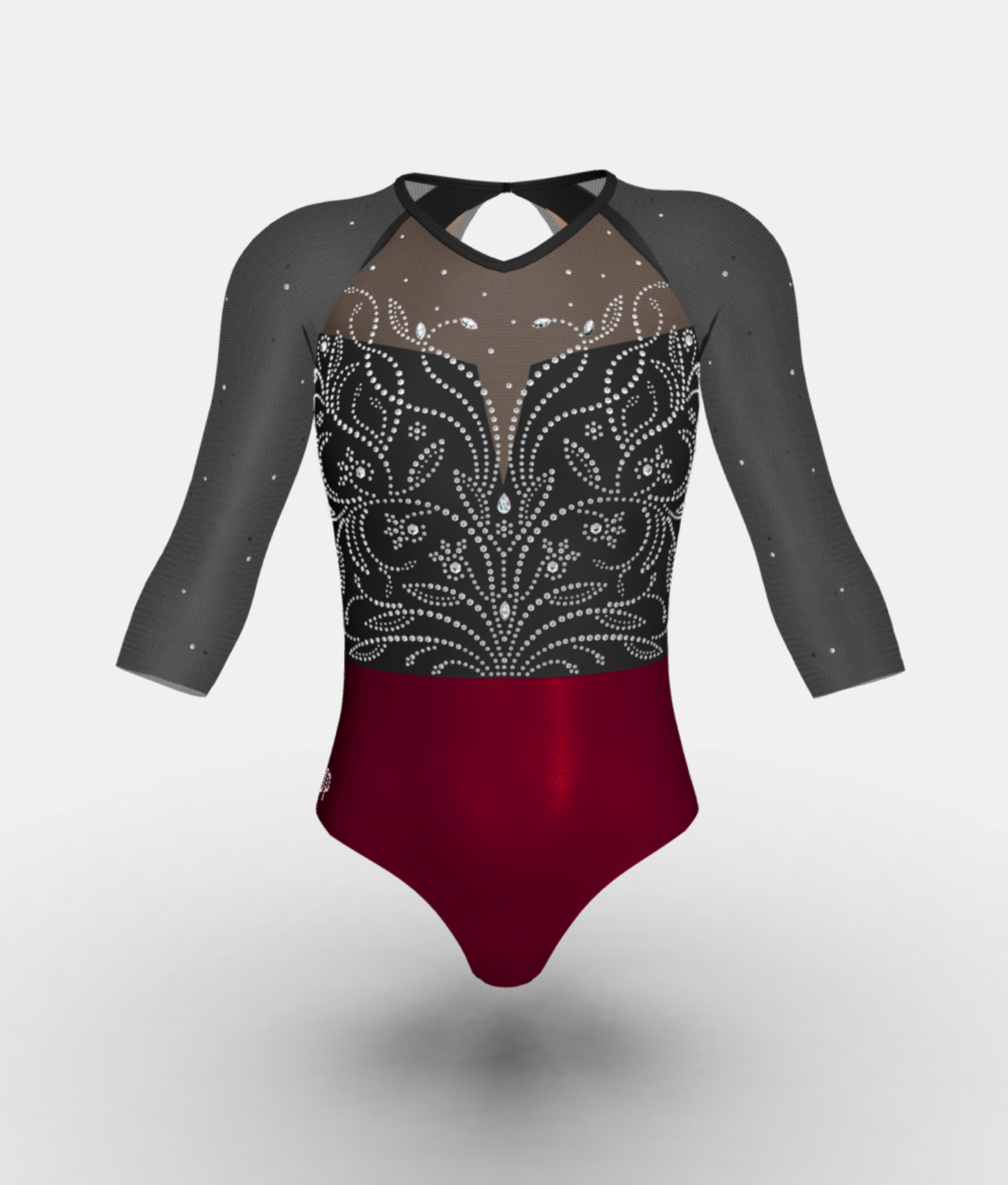 Majestic & regal with that elusive je ne sais qoi quality—the Adele design is an era-defining moment. Styled in a V-neckline with a clasp & keyhole at the back for ease of movement, the back shape is a dual-layer delight. A mesh underlay compliments twisted & criss-cross straps that offer a design innovation. Through the front, an angular sweetheart panel line is juxtaposed with exquisite bodice-defining crystals oozing old Hollywood glamour. Cut from our matt lycra upper bodice, lower & back strap that is soft yet durable, with mesh panels & sleeves. The front of this leotard is fully lined for complete athlete comfort with back mesh body panels fully lined with skin lining for zero transparency.