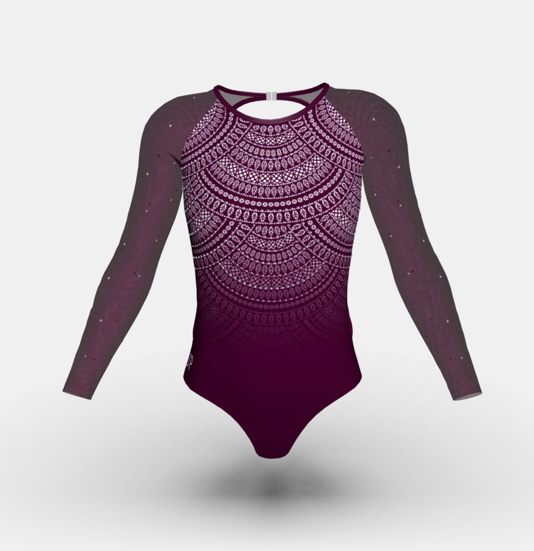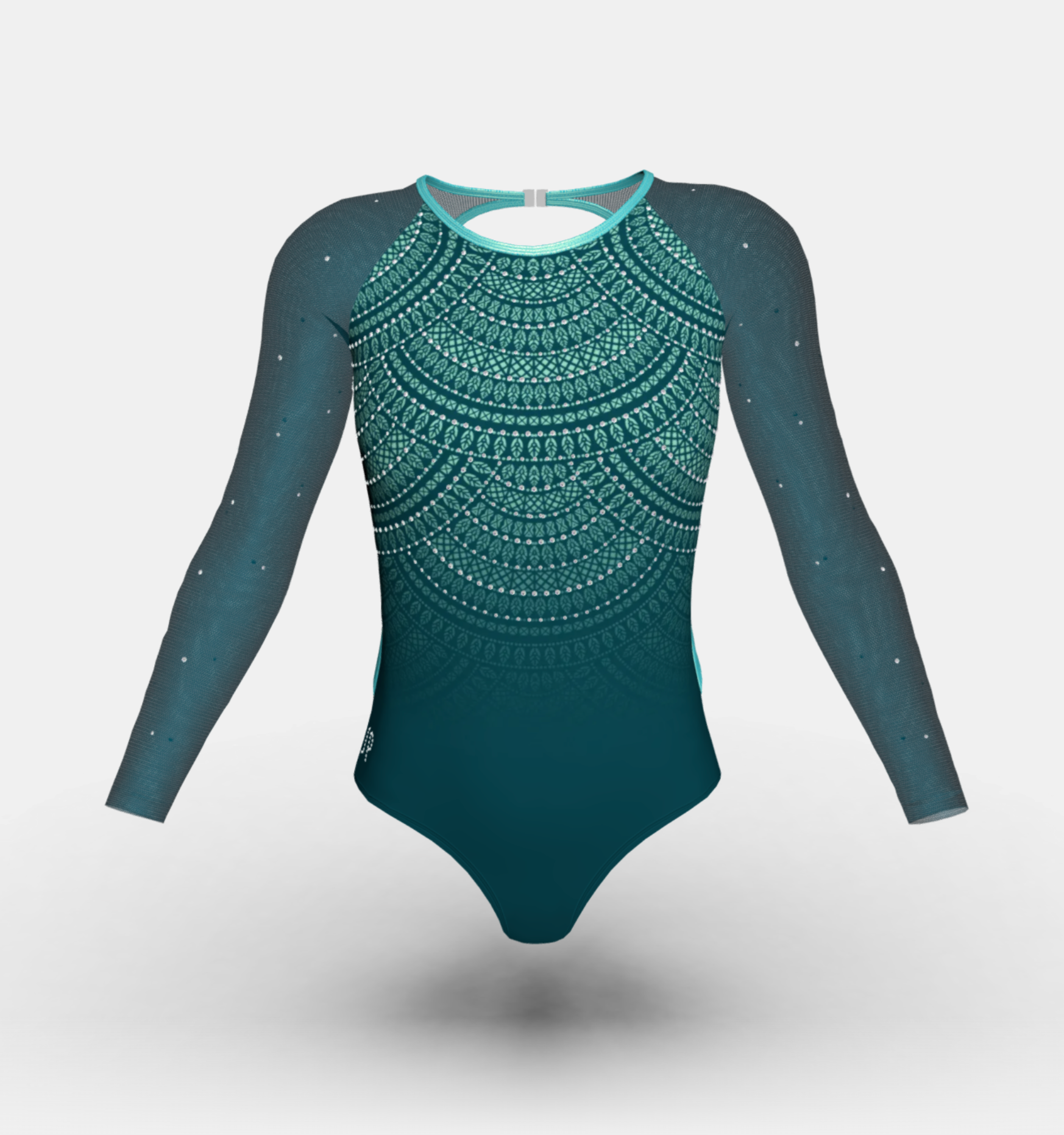 Shine like a diamond in the Aria design. Crafted in a round neckline shape with added clasp and keyhole at the back for ease. The body features a sublimated design with intricate pattern and ombre styling. Sleeves are constructed from mesh in a raglan style. Additional straps at the back are overlaid onto the main body to ensure full coverage. Crystals flow through the front bodice design with a light scatter over the sleeves.
